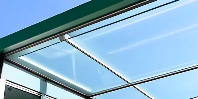 Козырёк оснащён датчиками погоды, которые отслеживают ключевые показатели: осадки, силу ветра, интенсивность солнечного излучения. При изменении погодных условий система управления автоматически меняет угол наклона стекла таким образом, чтобы: